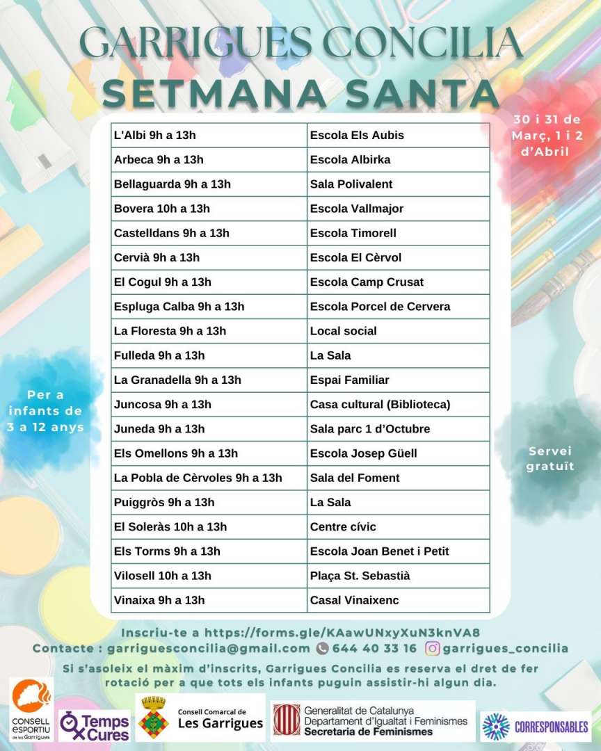 I molt important: si s’assoleix el màxim d’inscrits, Garrigues Concilia es reserva el dret de fer rotació perquè tots els infants puguin assistir-hi algun dia.