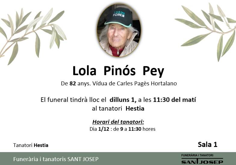 DEFUNCIÓ - LOLA PINÓS PEY De 82 anys, vídua de Carles Pagès Hortalano Tota la família us agraeix les mostres de condolences rebudes. Prem sobre la imatge per realitzar un zoom
