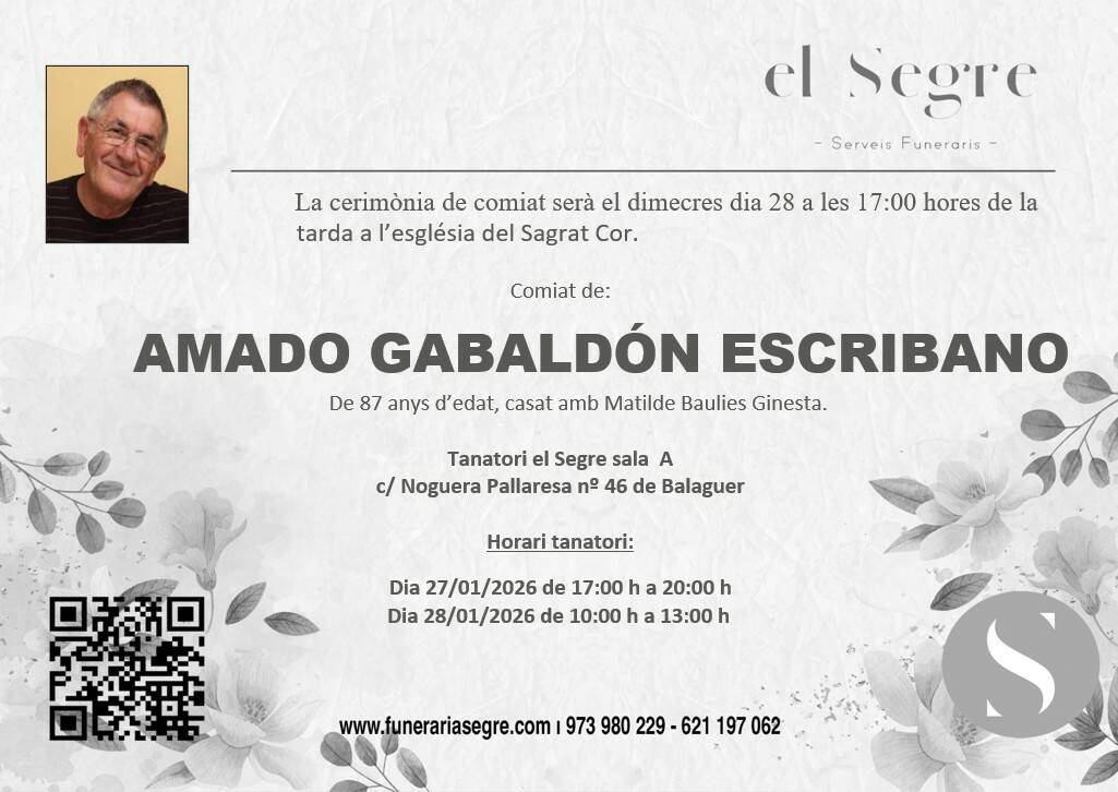 DEFUNCIÓ - AMADO GABALDÓN ESCRIBANO De 87 anys, casat amb Matilde Baulies Ginesta.Tota la família us agraeix les mostres de condol rebudes. Prem sobre la imatge per realitzar un zoom « Anterior Següent »