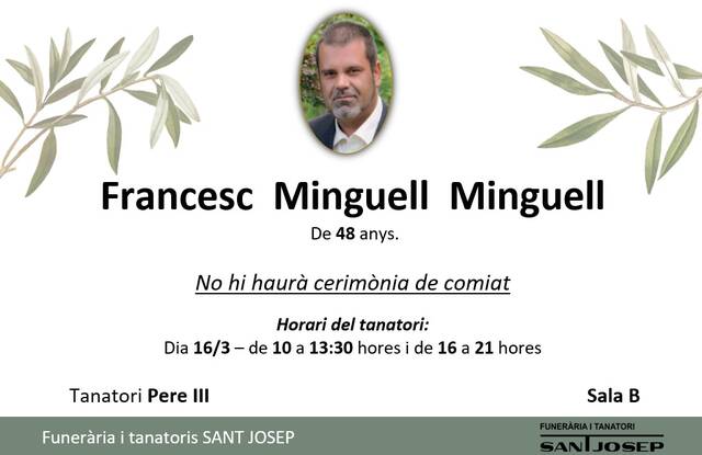 DEFUNCIÓ - FRANCESC MINGUELL MINGUELL De 48 anys.Tota la família us agraeix les mostres de condol rebudes. Prem sobre la imatge per realitzar un zoom Següent »