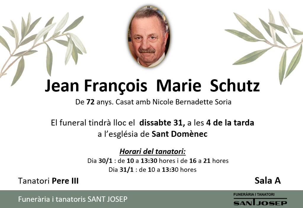 DEFUNCIÓ - JEAN FRANÇOIS MARIE SCHUTZ De 72 anys, casat amb Nicole Bernadette SoriaTota la família us agraeix les mostres de condol rebudes. Prem sobre la imatge per realitzar un zoom