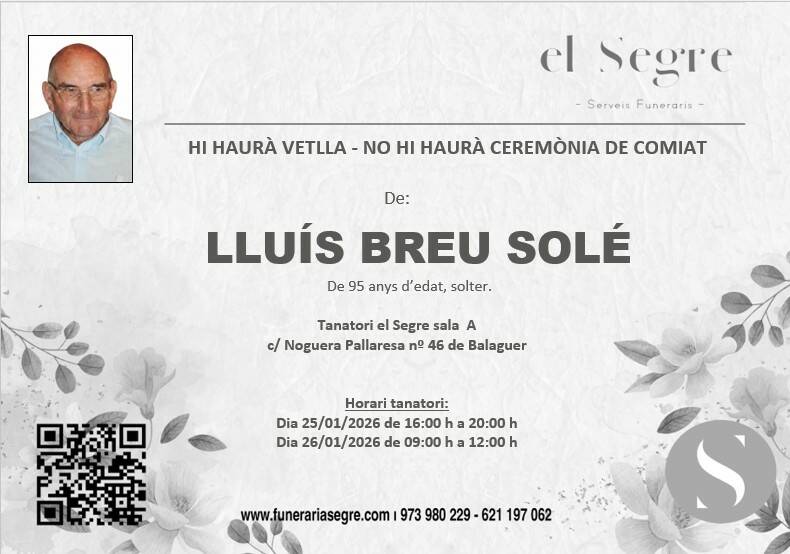 DEFUNCIÓ - LLUÍS BREU SOLÉ De 95 anys, solter Tota la família us agraeix les mostres de condol rebudes. Prem sobre la imatge per realitzar un zoom « Anterior Següent »