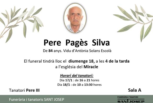 DEFUNCIÓ - PERE PAGÈS SILVA De 84 anys, vidu d'Antònia Solans EscolàTota la família us agraeix les mostres de condol rebudes. Prem sobre la imatge per realitzar un zoom « Anterior Següent »
