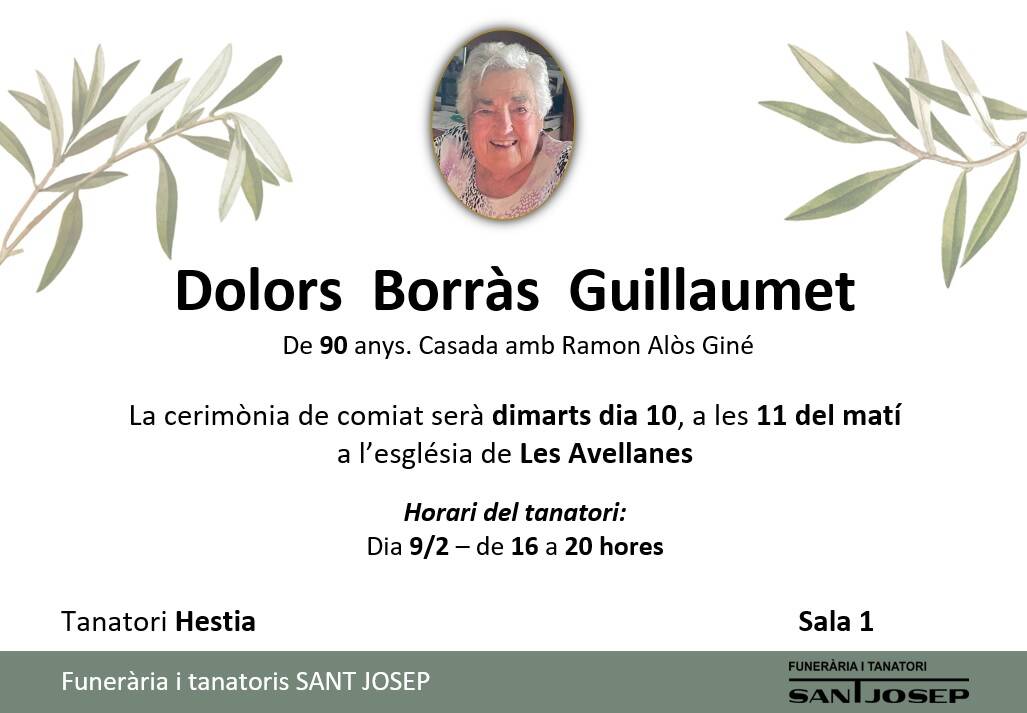 FALLECIMIENTO - DOLORS BORRÀS GUILLAUMET De 90 años, casada con Ramon Alòs Giné Toda la familia le agradece las muestras de pésame recibidas. Pulsa sobre la imagen para realizar un zoom