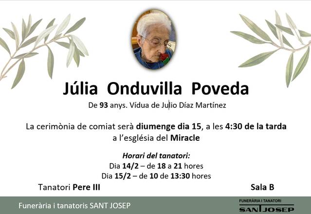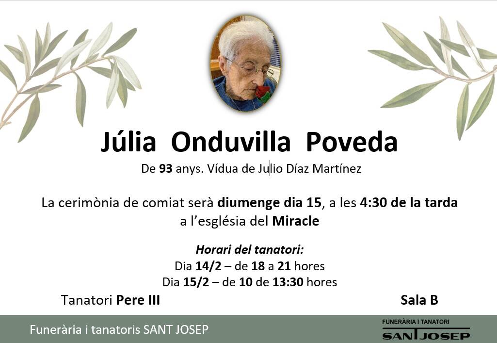 FALLECIMIENTO - JULIA ONDUVILLA POVEDA De 93 años, casada con Julio Díaz Martínez Toda la familia le agradece las muestras de pésame recibidas. Pulsa sobre la imagen para realizar un zoom